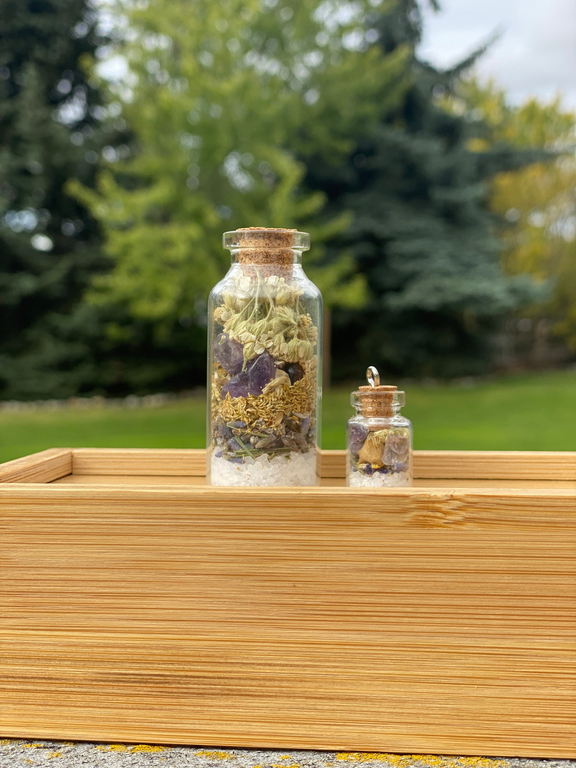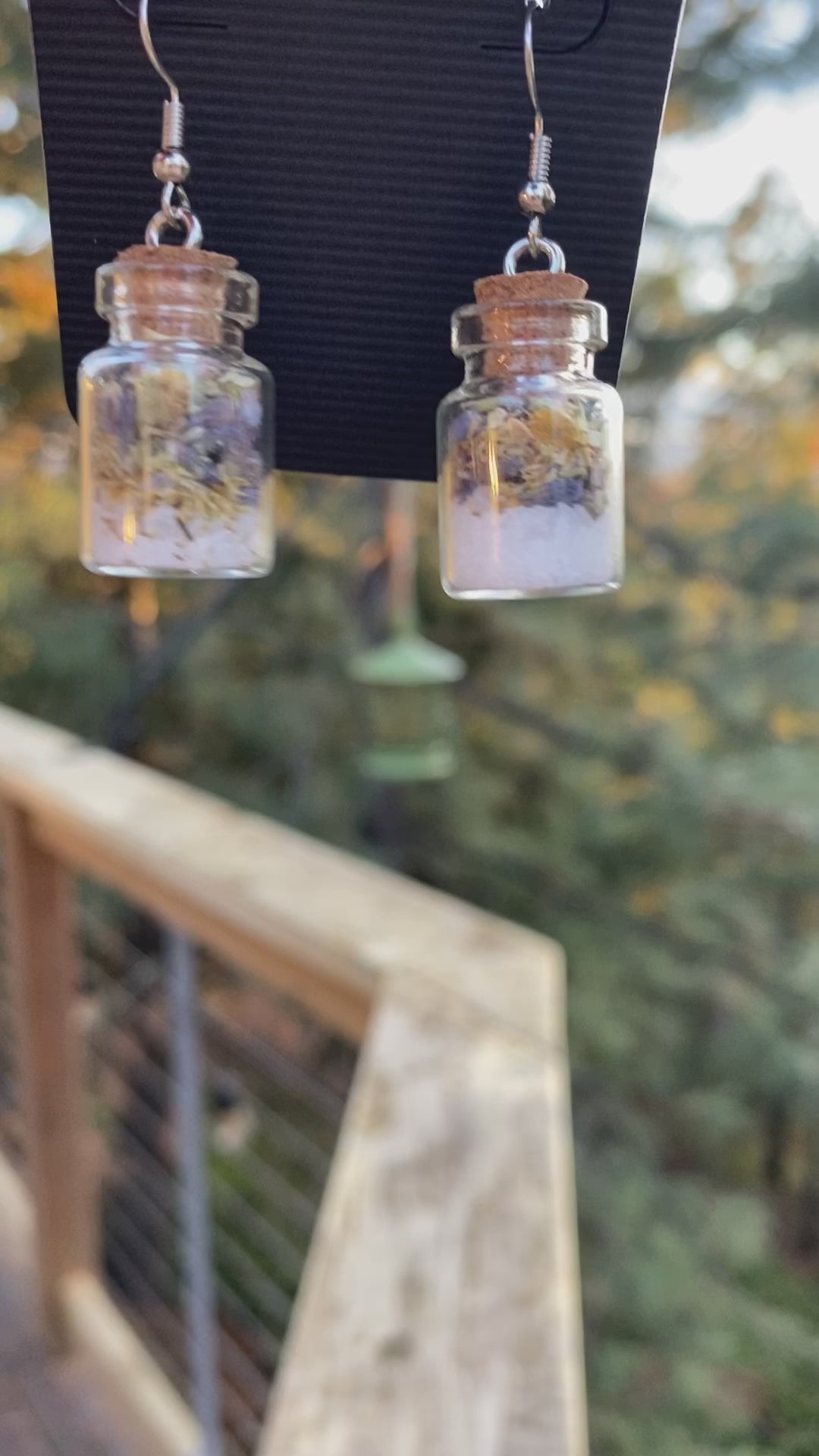 Anti anxiety spell jar earrings in mini glass bottles with cork closure; nickel free stainless steel ear wires. Wear regularly to remind you to take a deep breath and let go.