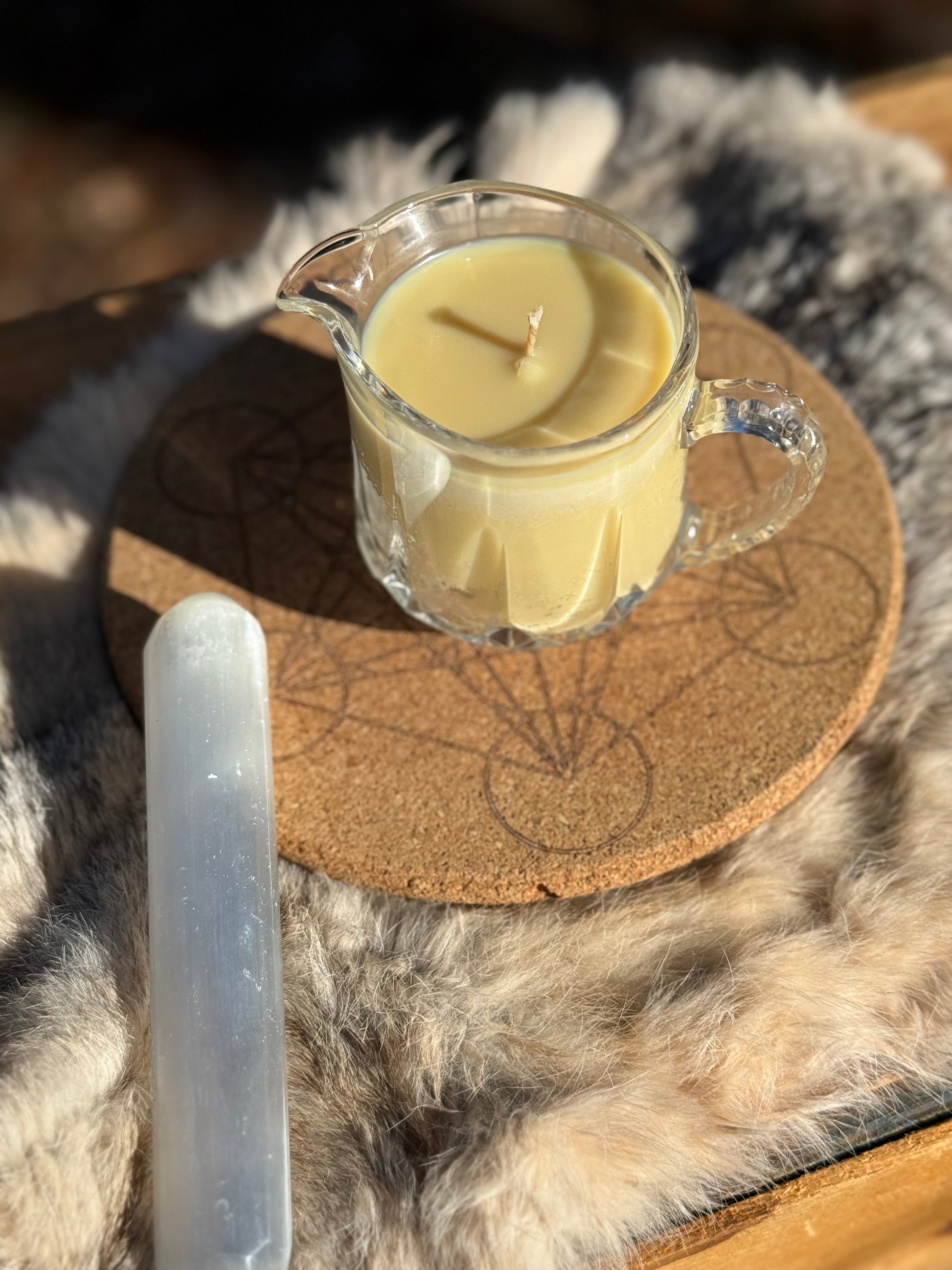 Luxurious candle in a beautiful vintage etched crystal glass pitcher with classic cotton wick that melts into a warm body oil. Great for massage and/or dry winter skin.