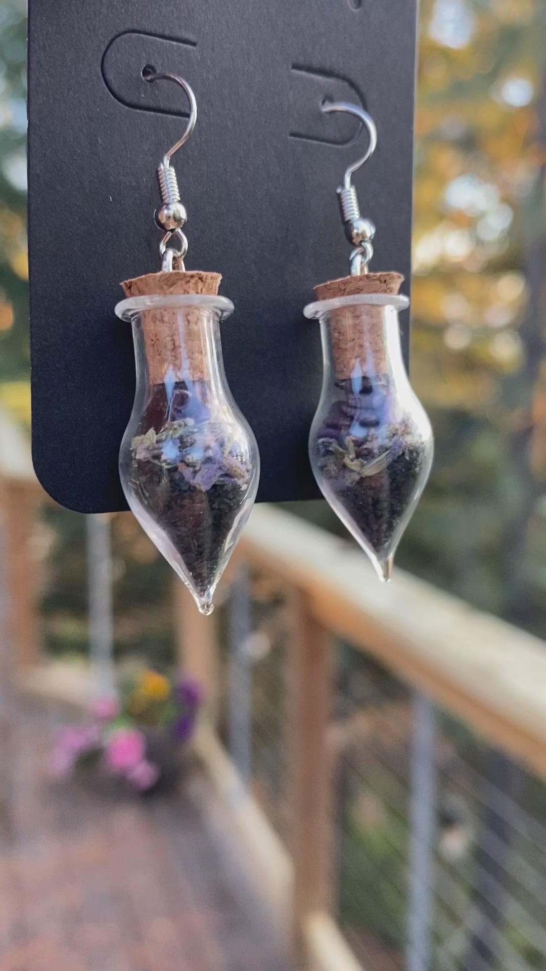 Divine Goddess spell jar earrings in mini glass bottles with pointy tip and cork closure; nickel free stainless steel ear wires. Wear regularly to further awaken your divine goddess energy.