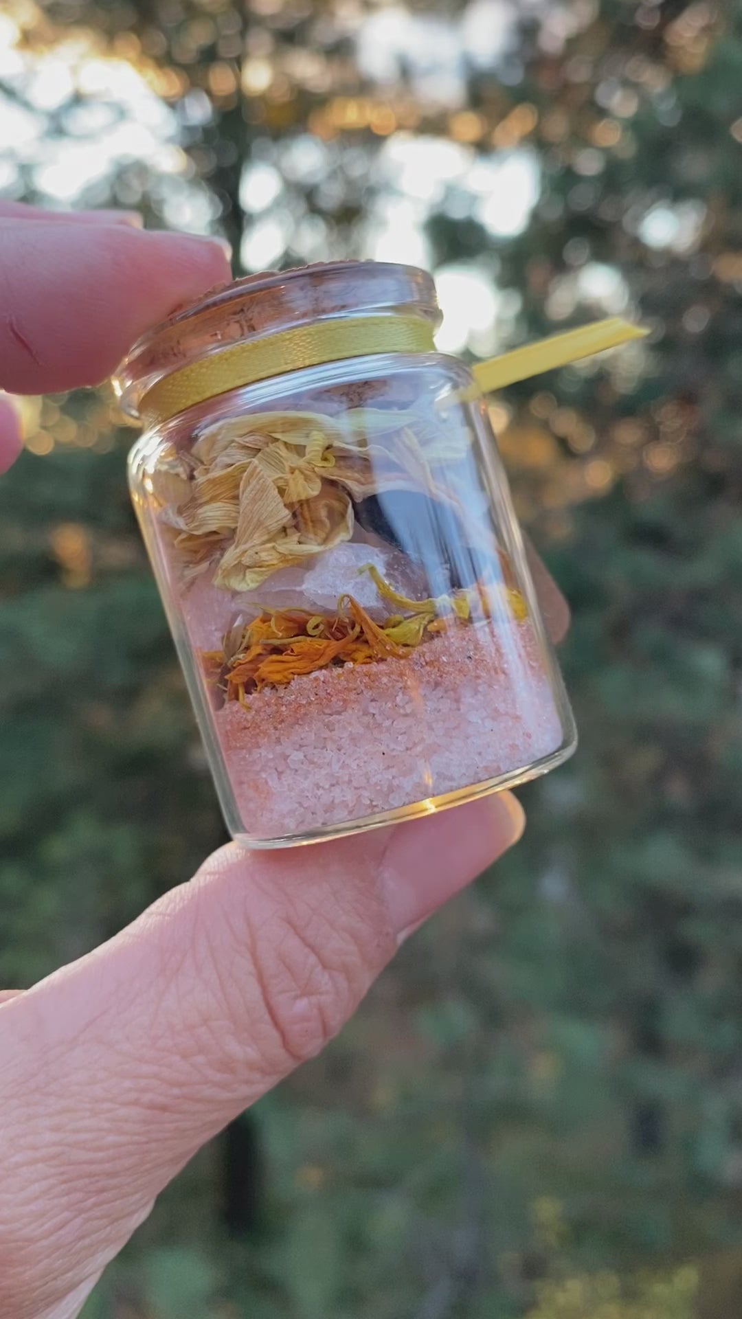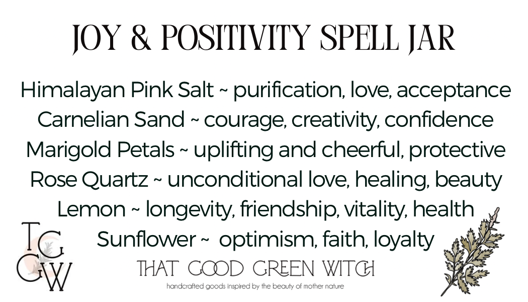 Small JOY & POSITIVITY spell jar in square glass bottle with cork closure.