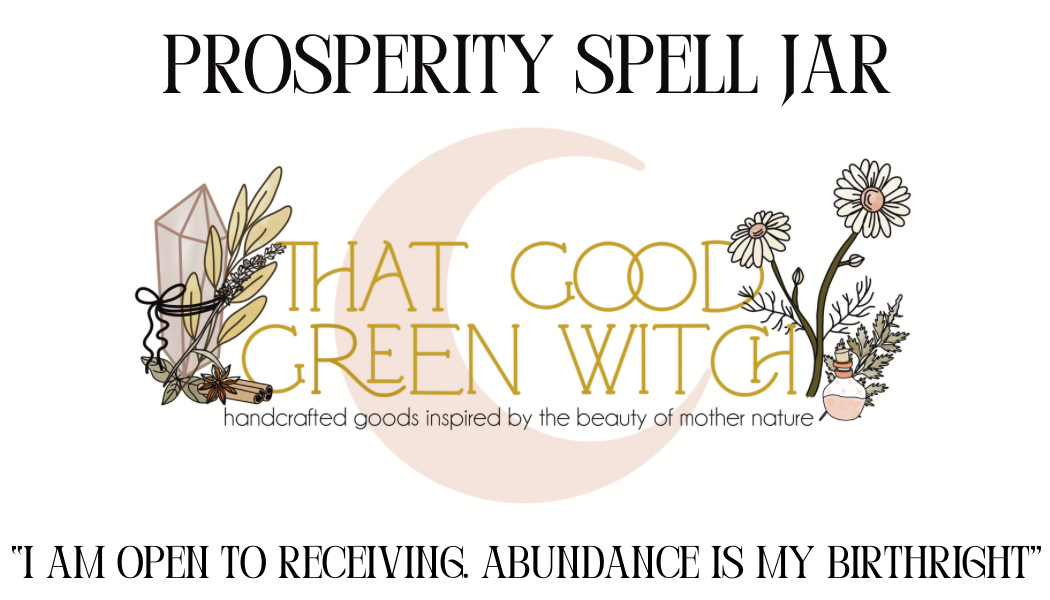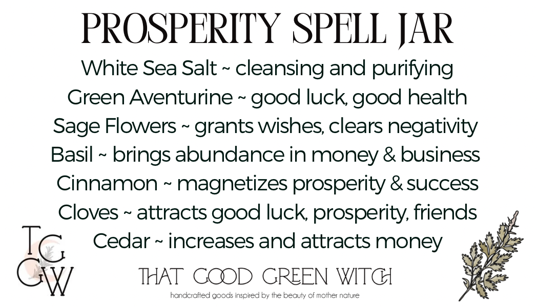 Small (larger of two pictured) Prosperity spell jar in glass bottle with cork closure. Place on your altar, entryway, nightstand, desk, in your car or anywhere you’ll see it regularly to remind you to be open to receiving abundance.
