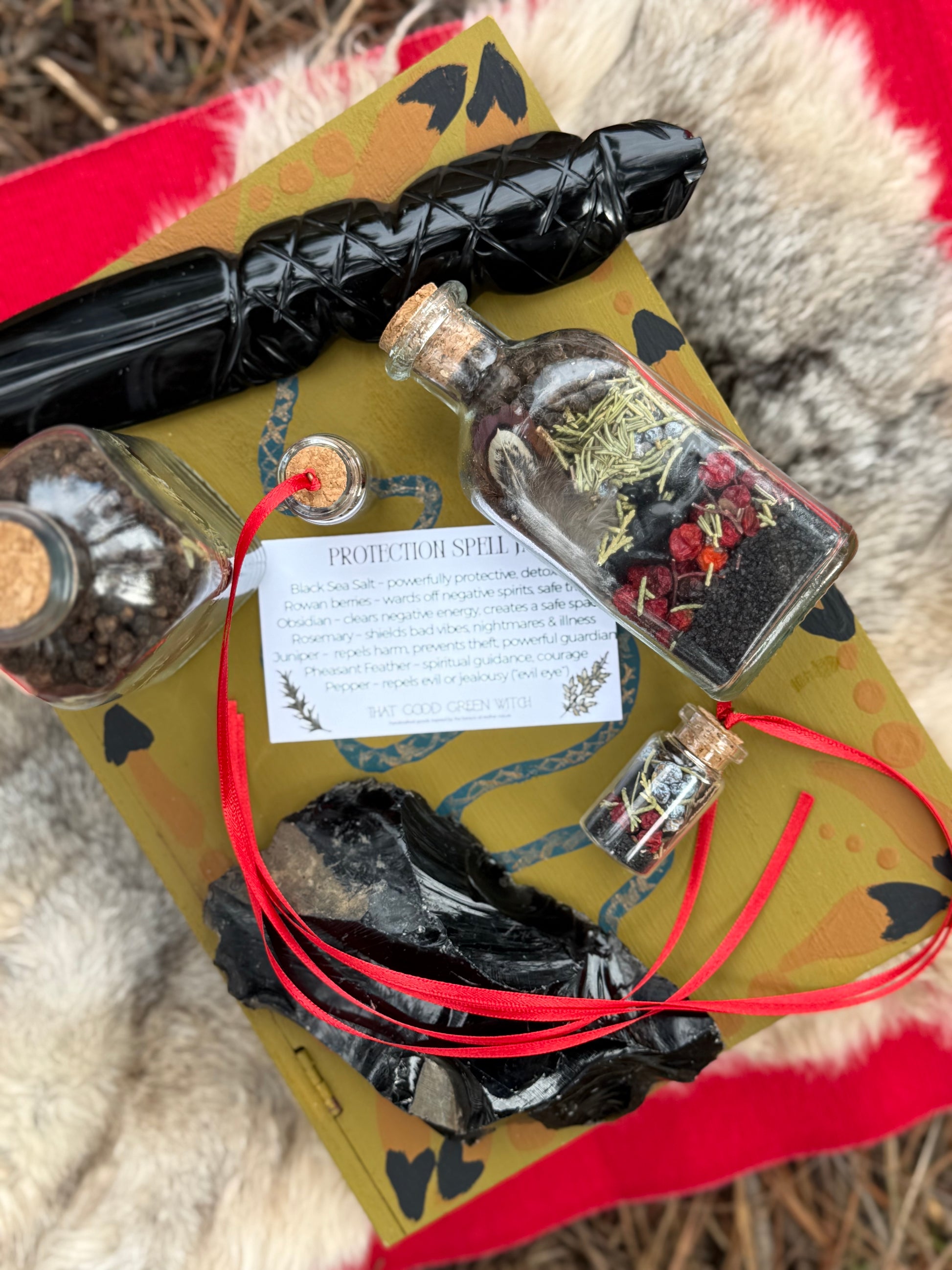 Altar size protection jar, includes card that lists ingredients and some of their metaphysical properties on back. Each batch is unique π€