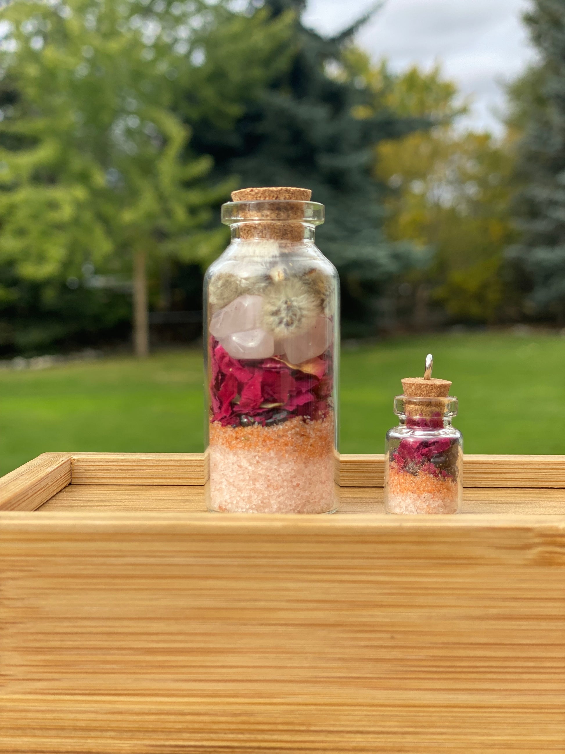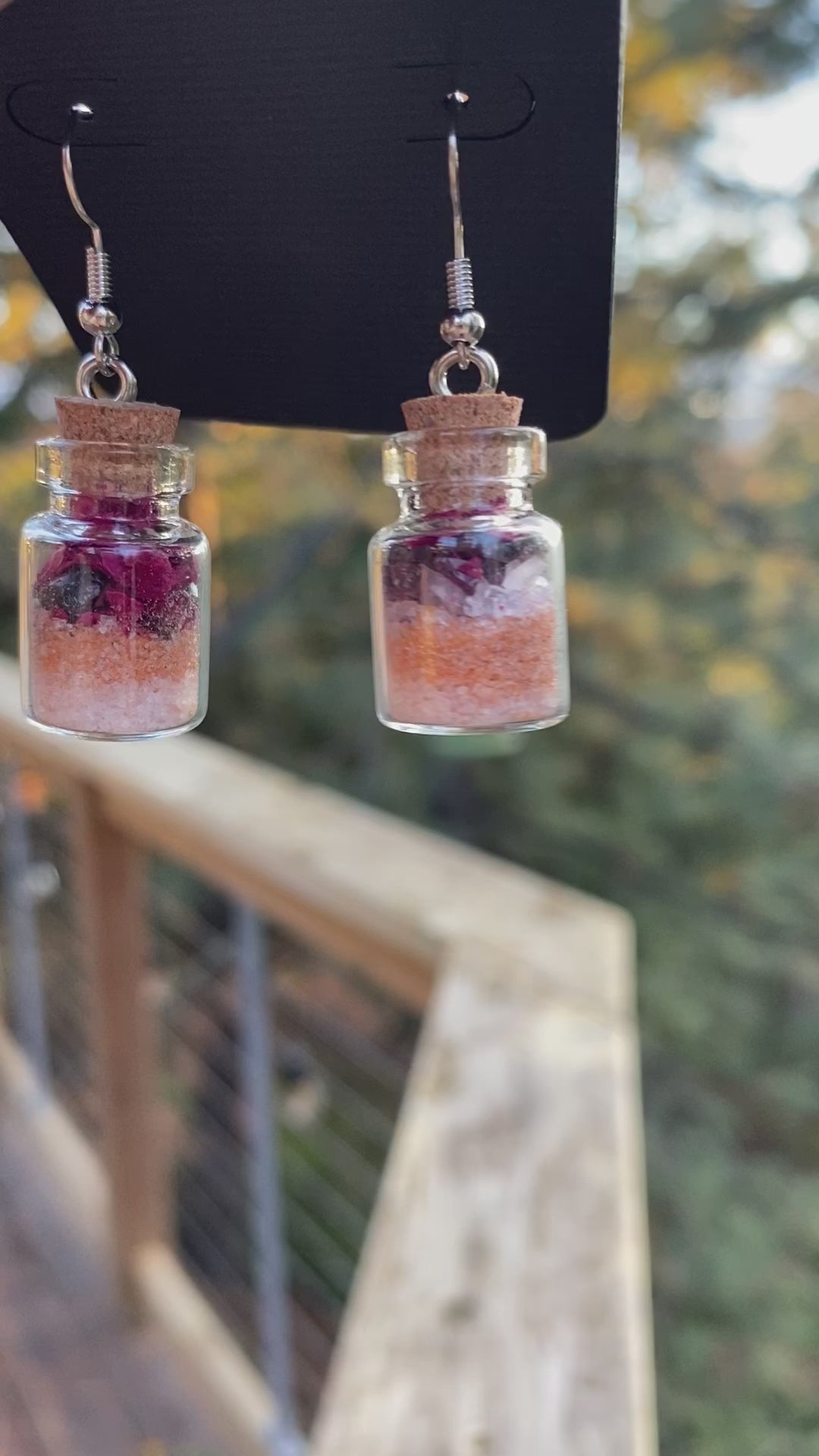 Universal love spell jar earrings in mini glass bottles with cork closure; nickel free stainless steel ear wires. Wear regularly as a reminder to exude your loving energy wherever you may go.